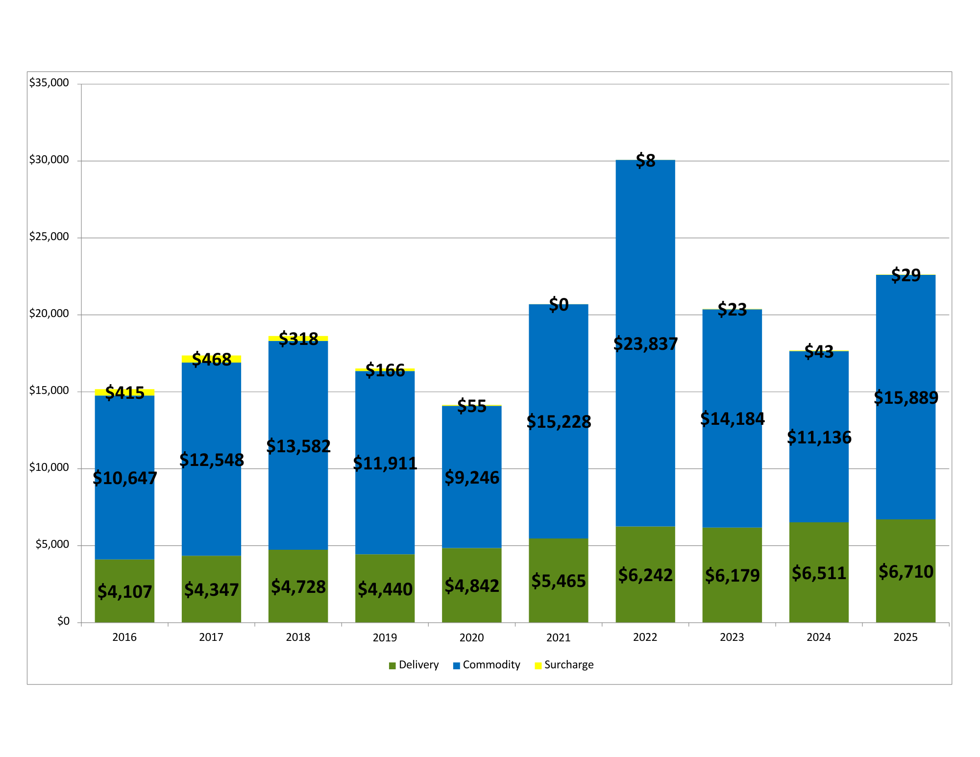 Interested in what comprises a typical large nonresidential natural gas bill? The graphs below compare average monthly natural gas bills over the last 10 years for large nonresidential customers who purchased their natural gas supply from NYSEG.