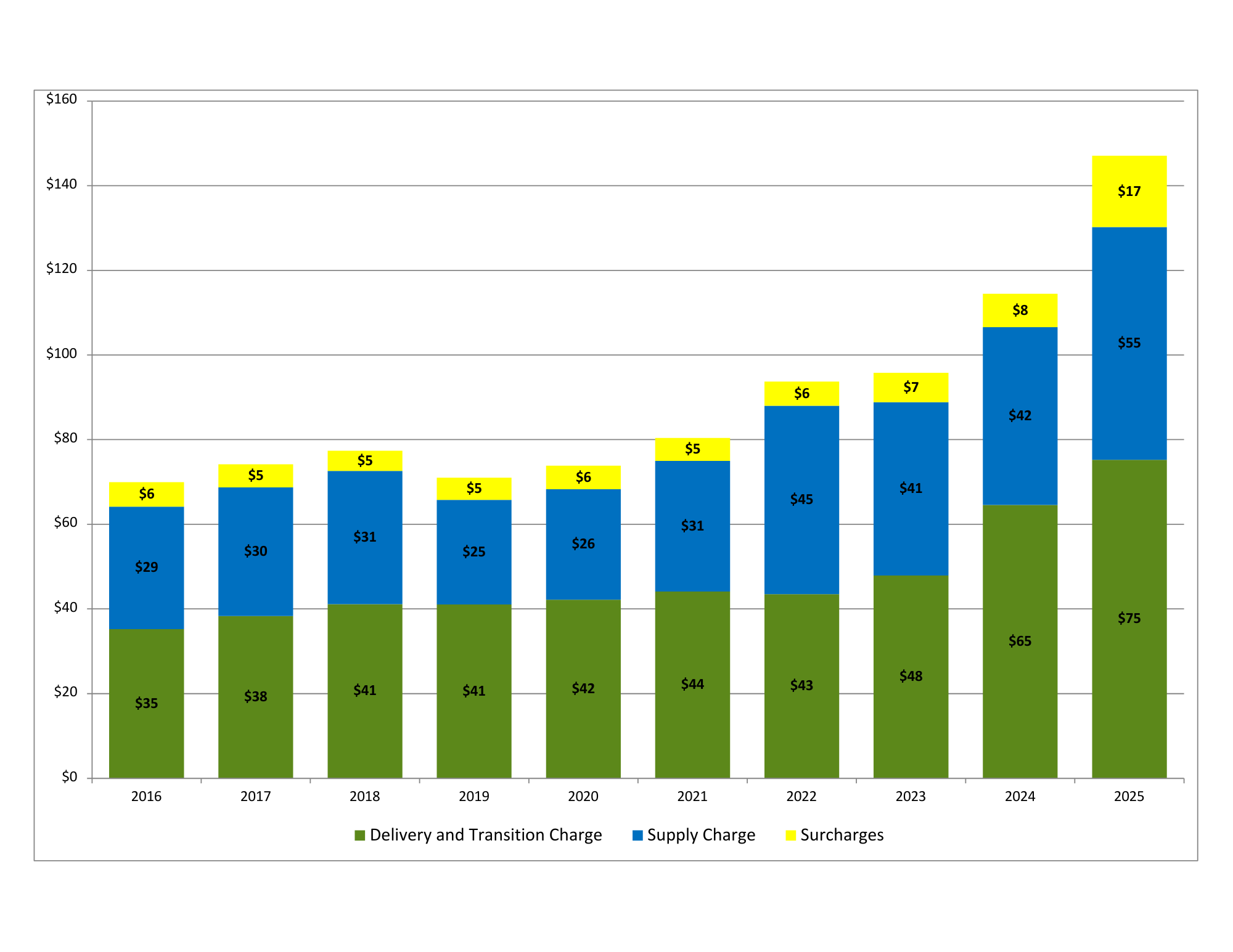 Interested in what comprises a typical residential electricity bill? The graphs below compare average monthly electricity bills over the last 10 years for residential customers who purchased their electricity supply from NYSEG.